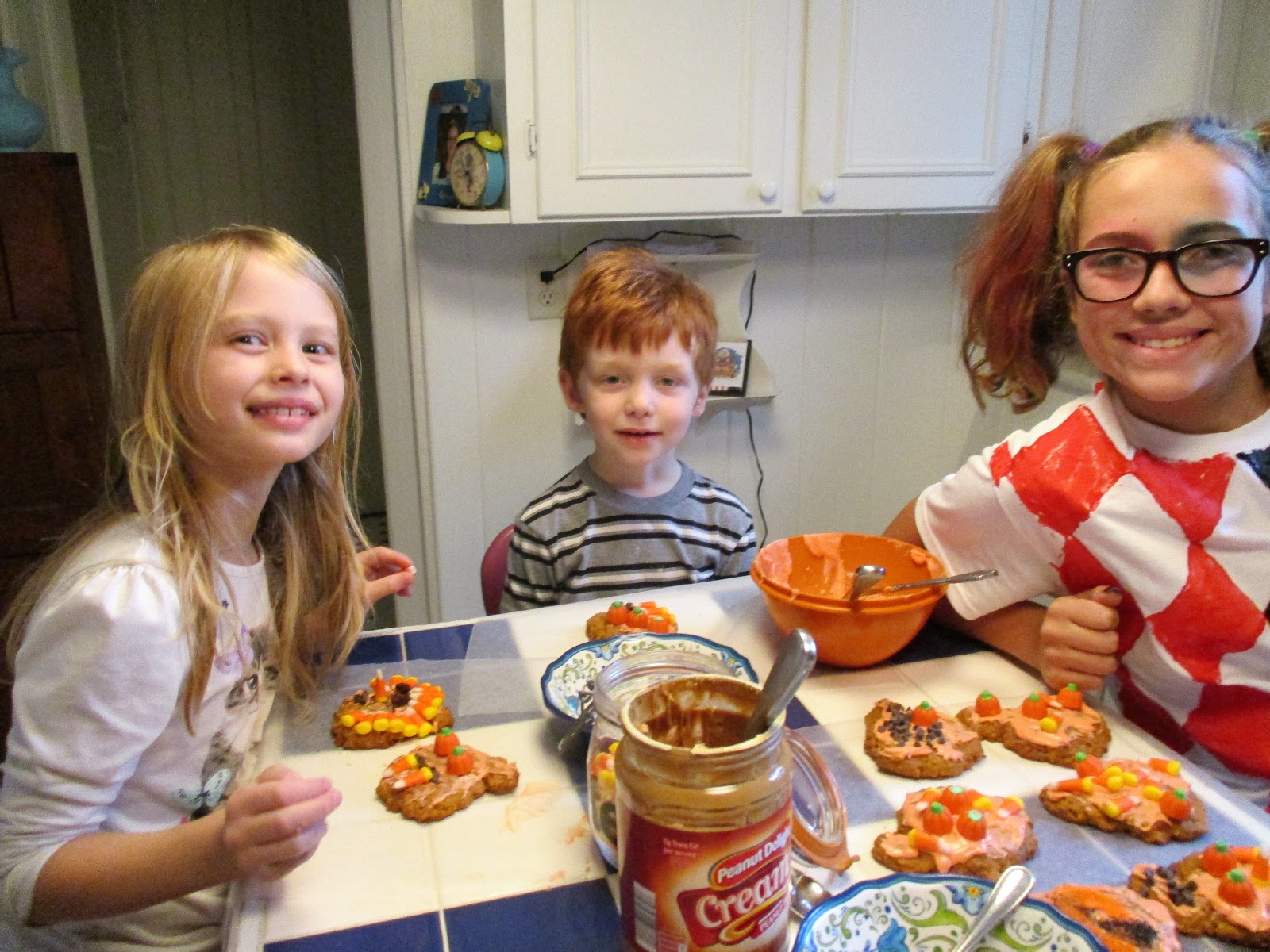 pumpkin cookies for over 30 years and decorating them with my grandchildren for the past 9 years, starting with Cassidy. There's always frosting, peanut butter (so good on the cookies) mini chocolate chips, candy corn, pumpkins, raisins and sprinkles to decorate with.